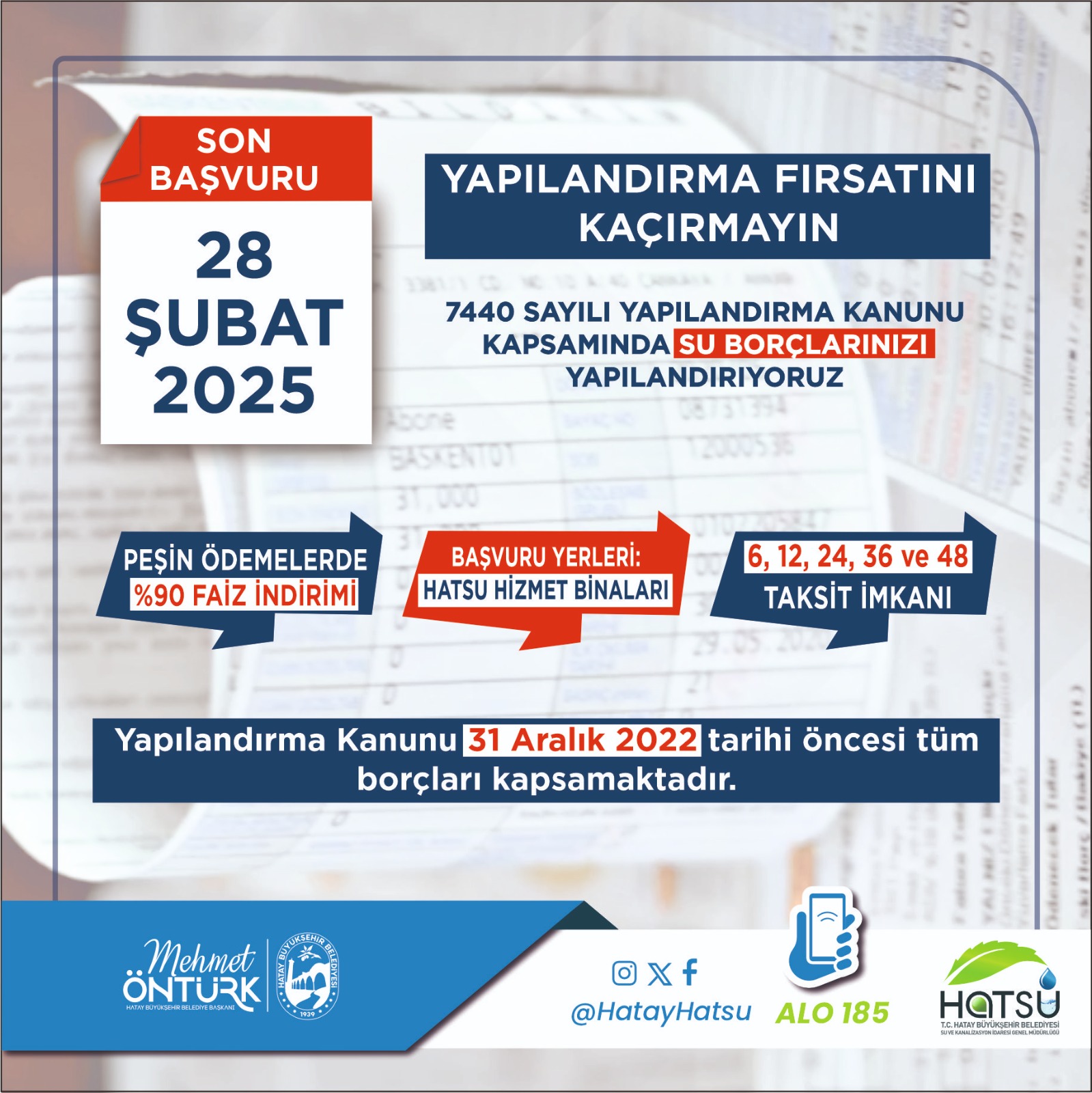 Hatay Büyükşehir Belediyesi Bazı Alacakların Yeniden Yapılandırılmasına Dair 7440 Sayılı Kanun kapsamında vatandaşların, 31 Aralık 2022 tarihi öncesini kapsayan su borçlarını peşin veya taksitli şekilde ödeyebileceğini açıkladı.