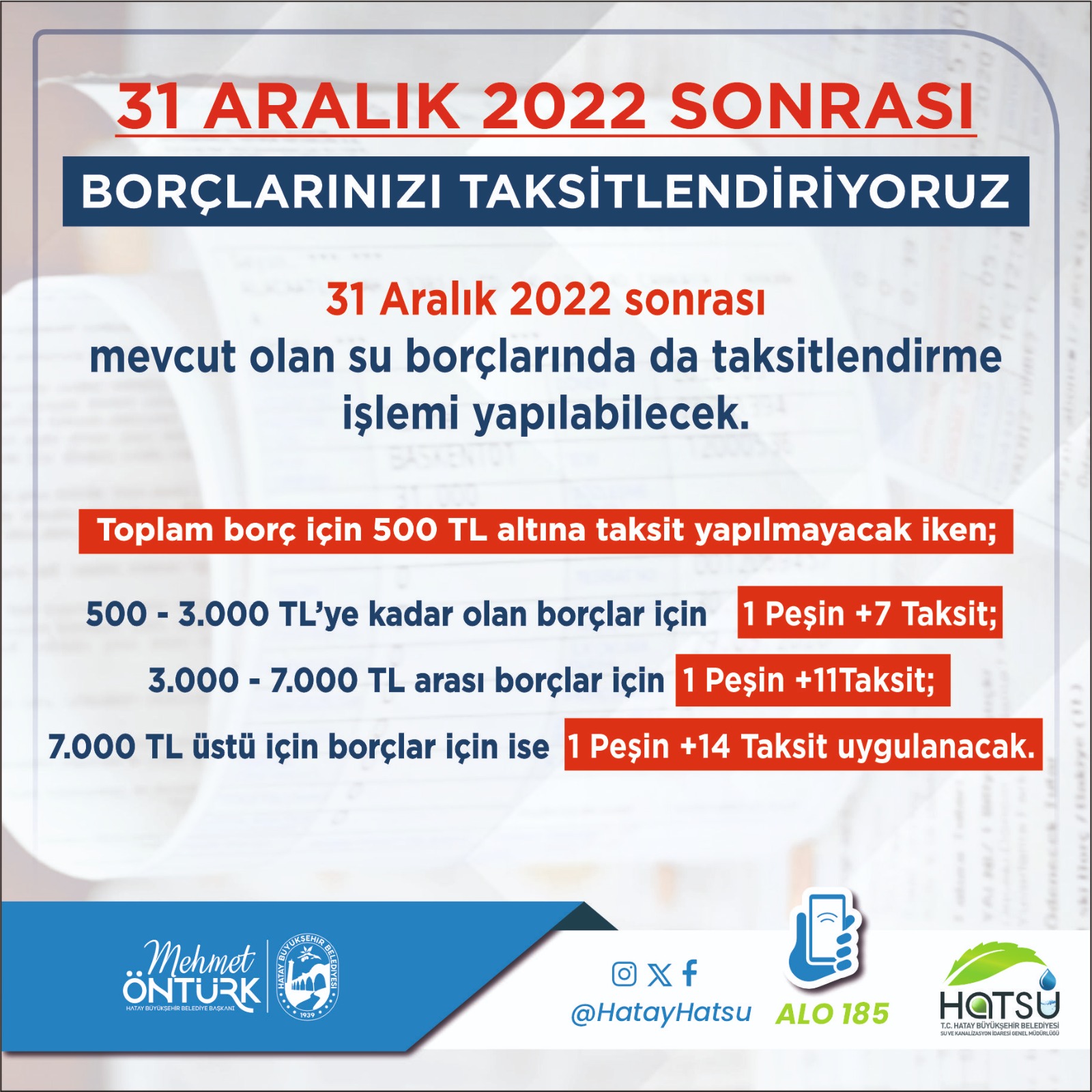 HBB Su ve Kanalizasyon İdaresi Genel Müdürlüğü (HATSU), 31 Aralık 2022 (Bu tarih dahil) öncesi yapılandırma ve 31 Aralık 2022 sonrası su borcu olan abonelerin taksitlendirme başvurusunda bulunabileceğini duyurdu.