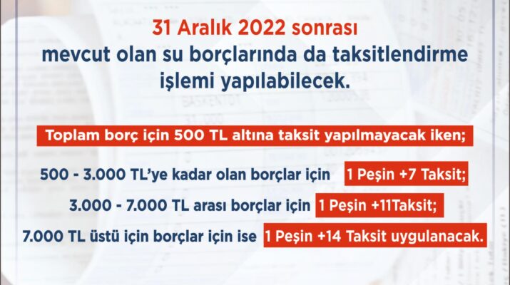 HBB Su ve Kanalizasyon İdaresi Genel Müdürlüğü (HATSU), 31 Aralık 2022 (Bu tarih dahil) öncesi yapılandırma ve 31 Aralık 2022 sonrası su borcu olan abonelerin taksitlendirme başvurusunda bulunabileceğini duyurdu.