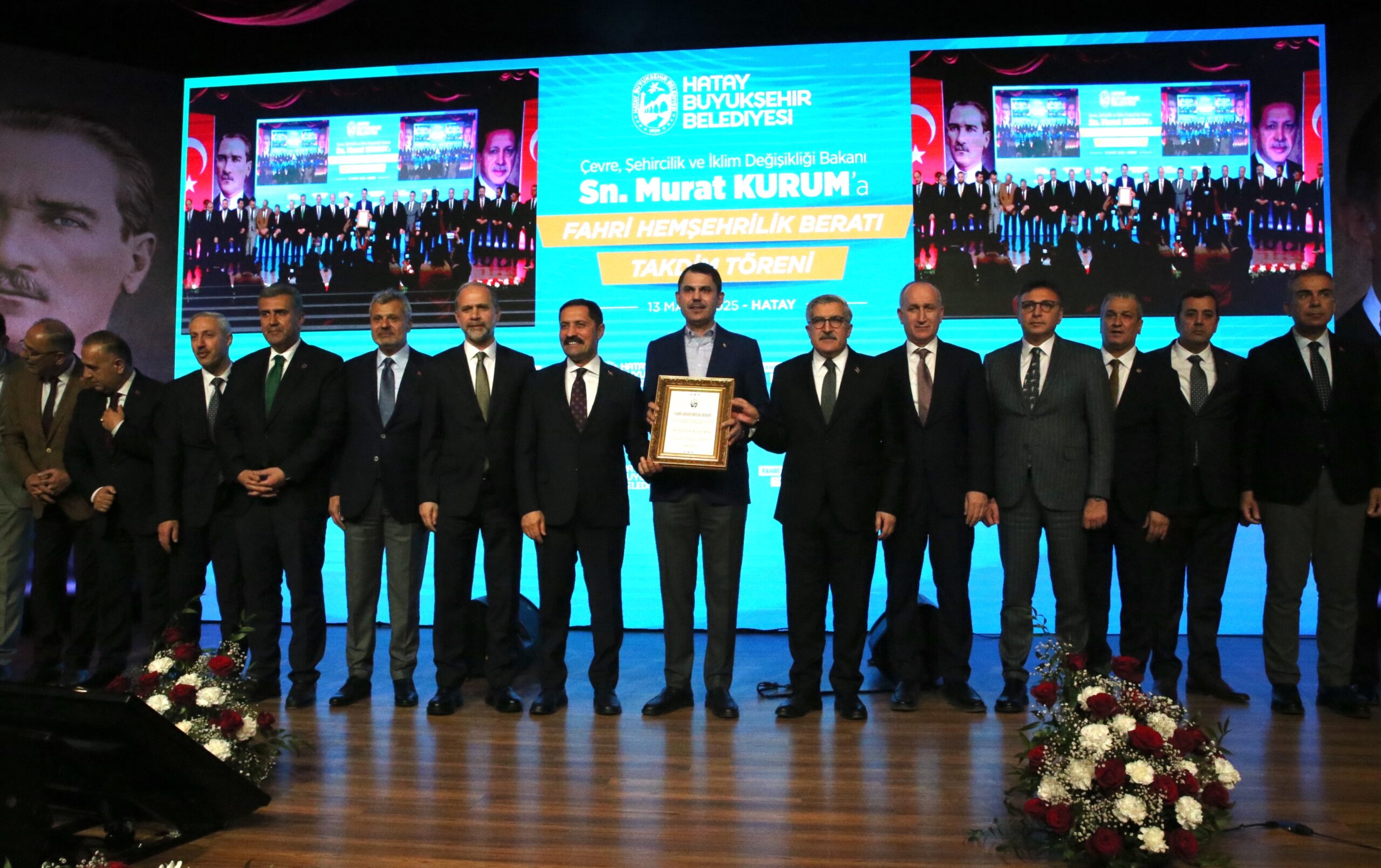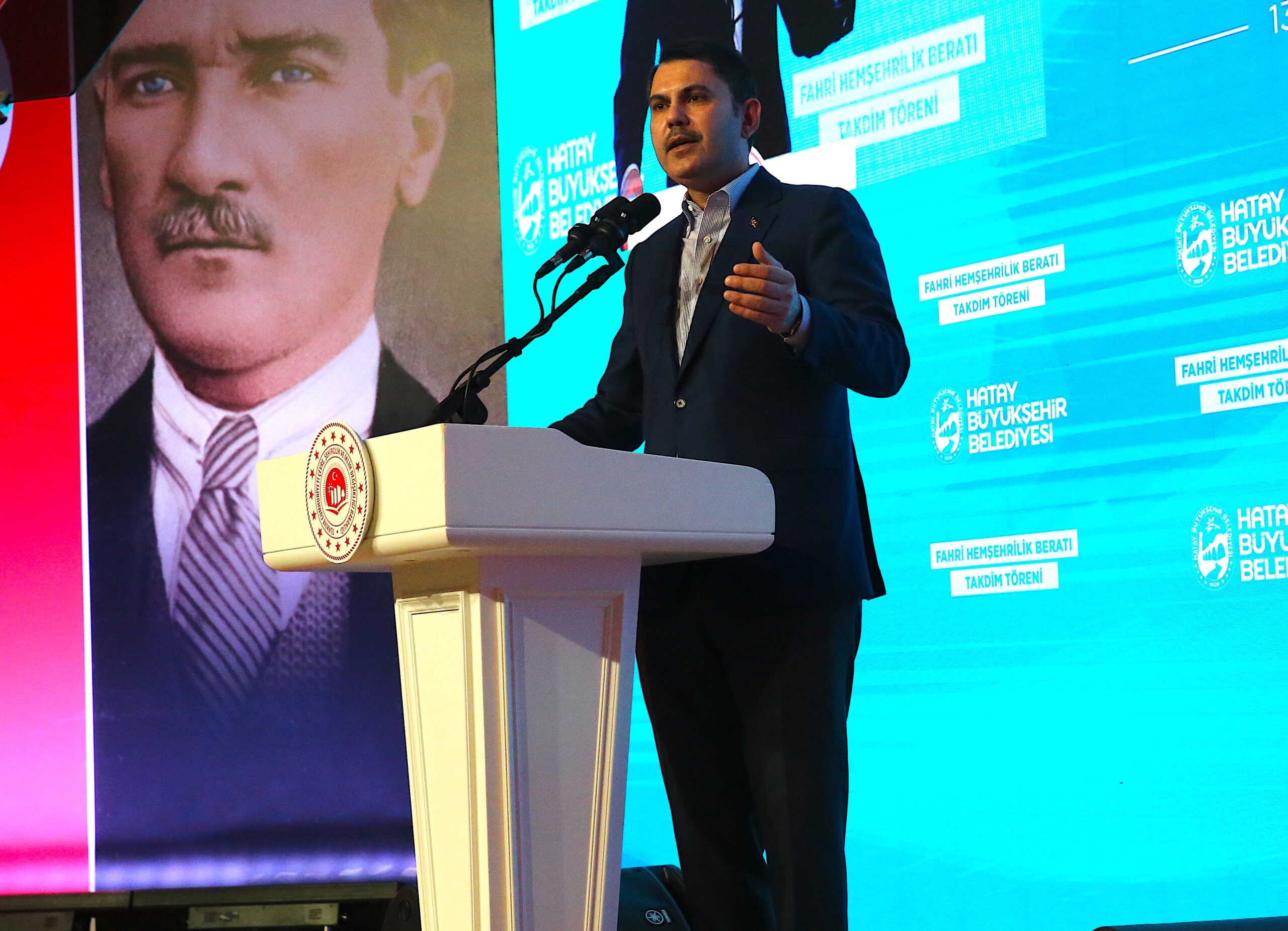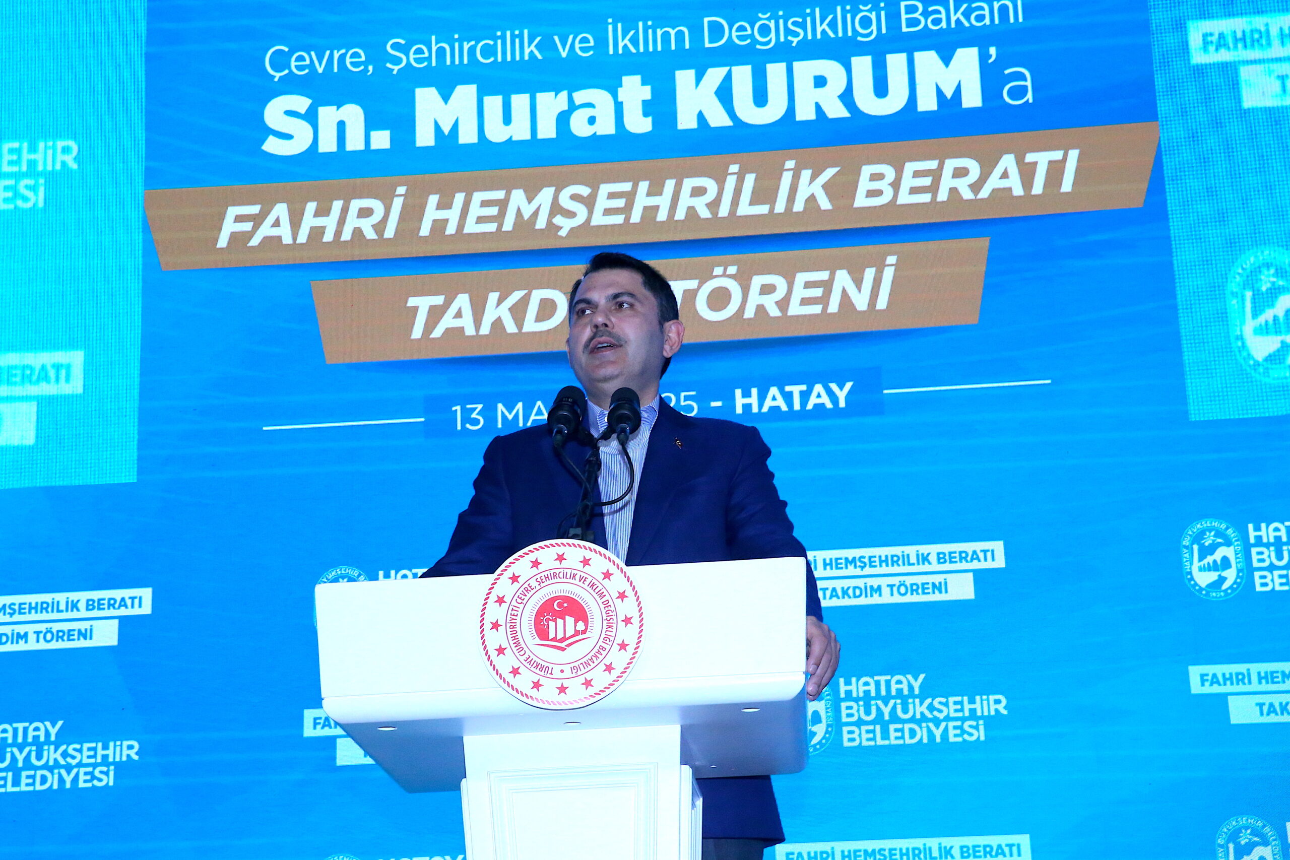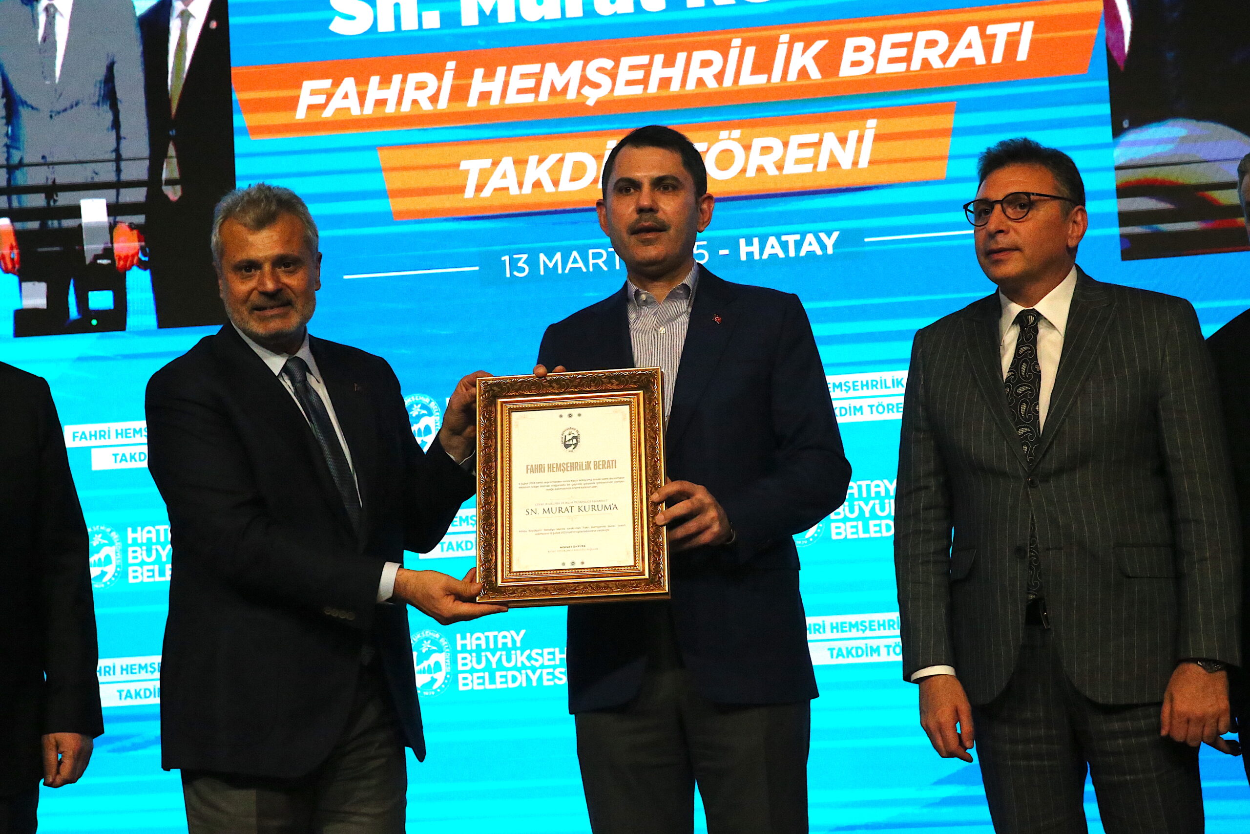 Kurum, Hatay sevdalarının fahri hemşehrilik beratıyla taçlandığını vurgulayarak, “Şundan emin olun bu hemşehrilik beratını ömür boyu şeref madalyası olarak taşıyacağım. Evimin en güzel yanına asacağım ve orada bu dünyadan göçene kadar da çocuklarıma şerefle, onurla anlatacağım. ‘Biz, Hatay’ımızı düştüğü yerden işte bu ekiple kaldırdık’ diyeceğim.” ifadesini kullandı.
