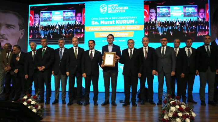 Kurum, Hatay sevdalarının fahri hemşehrilik beratıyla taçlandığını vurgulayarak, “Şundan emin olun bu hemşehrilik beratını ömür boyu şeref madalyası olarak taşıyacağım. Evimin en güzel yanına asacağım ve orada bu dünyadan göçene kadar da çocuklarıma şerefle, onurla anlatacağım. ‘Biz, Hatay’ımızı düştüğü yerden işte bu ekiple kaldırdık’ diyeceğim.” ifadesini kullandı.
