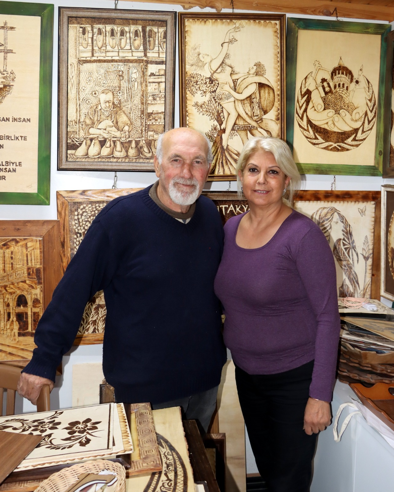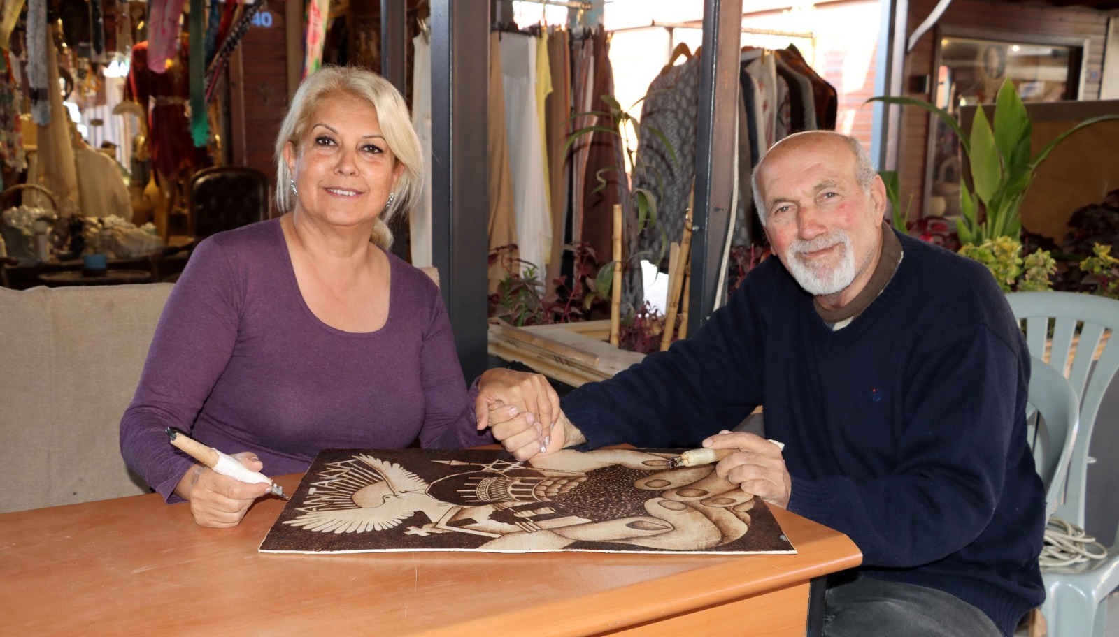 Gülbol çiftini, 24 Kasım Öğretmenler Günü’ne yetiştirmek için birlikte hazırladıkları Antakya temalı Pyrogravure tablosunun son dokunuşlarını yaparken ziyaret ettik. Sanatın ve emeğin sıcaklığının hissedildiği o anlarda çift, birbirlerinin Öğretmenler Günü’nü de kutlayarak duygu dolu bir atmosfer oluşturdu.