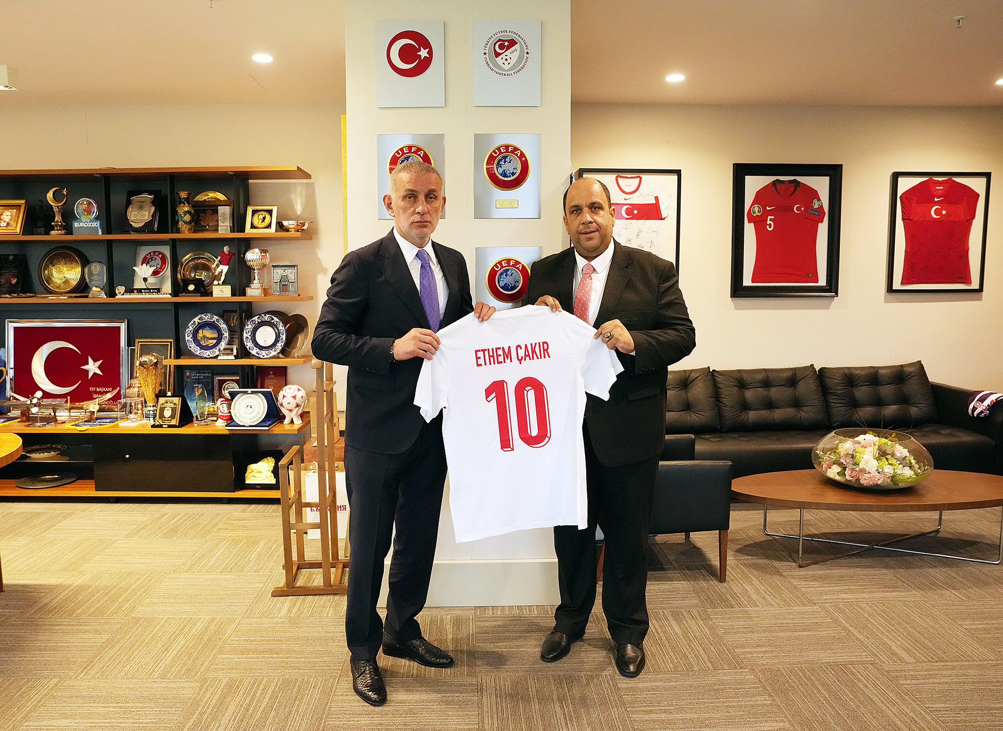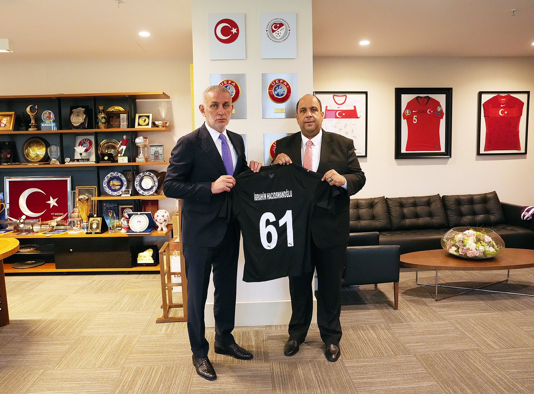 Atakaş Hatayspor Kulüp Başkanı Ethem Çakır, Türkiye Futbol Federasyonu (TFF) Başkanı İbrahim Ethem Hacıosmanoğlu’nu makamında ziyaret etti. Riva Hasan Doğan Millî Takımlar Kamp ve Eğitim Tesisleri’nde gerçekleşen görüşmeye, TFF 1. Başkan Vekili ve İcra Kurulu Üyesi Mecnun Otyakmaz ile kulüp saymanı Mustafa Sıraç da katıldı. Görüşmede, Atakaş Hatayspor’un mevcut durumu ele alınırken, TFF Başkanı Hacıosmanoğlu kulübe destek mesajını iletti. Karşılıklı jestler çerçevesinde Ethem Çakır’a bir A Millî Takım forması hediye edilirken, Çakır da Hacıosmanoğlu’na Atakaş Hatayspor forması takdim etti. Öte yandan, Cumhurbaşkanının Aralık ayında Hatay’a gerçekleştireceği ziyaret öncesinde, TFF Başkanı ile FIFA Başkanı arasında yapılması planlanan görüşmelerde Atakaş Hatayspor’a yönelik destek mesajlarının da gündeme alınacağı ifade edildi. Haber Merkezi