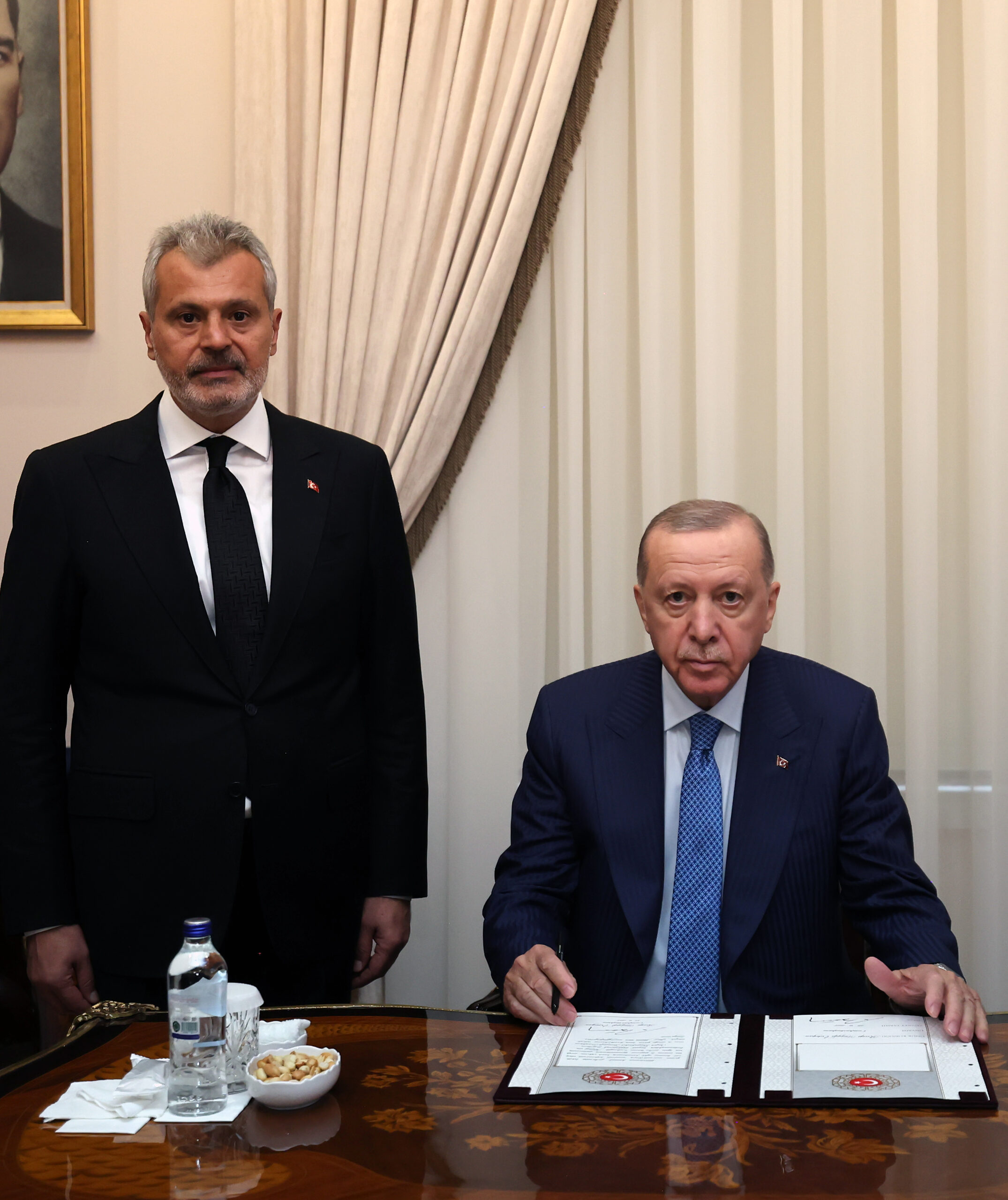 Hatay Büyükşehir Belediye Başkanı Mehmet Öntürk tarafından karşılanan Cumhurbaşkanı Erdoğan, belediyenin şeref defterini imzaladı.