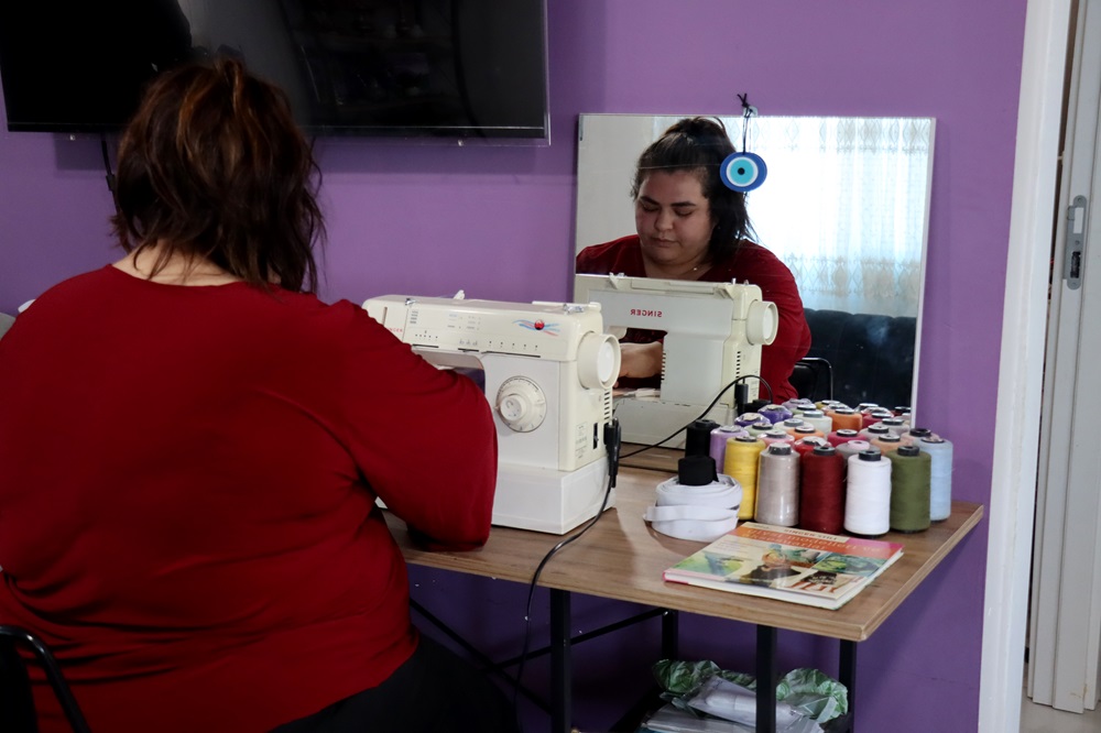 Evinin bir köşesini dikim atölyesine çeviren Geller, hem derneğin hem de mahallelinin siparişlerini dikerek ek kazanç elde ediyor.