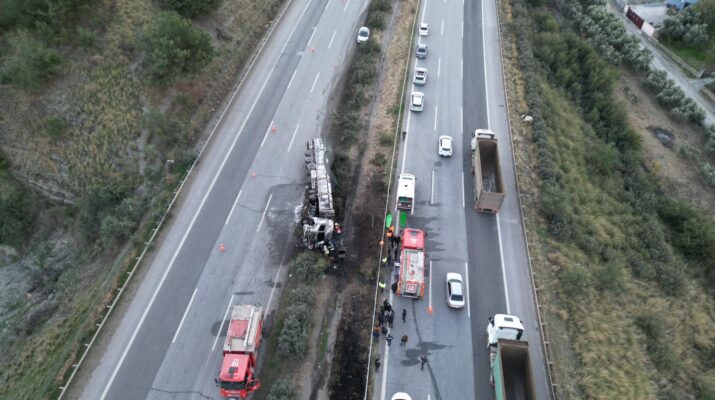 Hatay’ın Dörtyol ilçesinde refüje çarparak devrilen tırda çıkan yangında 2 kişi yaşamını yitirdi. Mehmet Handaş idaresindeki plakası öğrenilemeyen büyükbaş hayvan yüklü tır, Adana-İskenderun Otoyolu’nun Yeşil Mahallesi mevkisinde refüje çarparak devrildi. Devrilmesinin ardından yangın çıkan tırda bulunan büyükbaş hayvanlar yola savruldu. İhbar üzerine bölgeye 112 Acil Sağlık, itfaiye ve jandarma ekipleri sevk edildi. Yangın, ekiplerin müdahalesiyle söndürüldü. Sağlık ekiplerince yapılan kontrolde, tır sürücüsü Mehmet Handaş ile araçtaki Ahmet Handaş’ın hayatını kaybettiği belirlendi. Cenazeler, Dörtyol Devlet Hastanesi morguna götürüldü. Kaza nedeniyle otoyolun Payas-Dörtyol şeridi geçici olarak trafiğe kapatıldı. Öte yandan, yola savrulan büyükbaş hayvanların yakalanması için ekipler çalışma başlattı. AA
