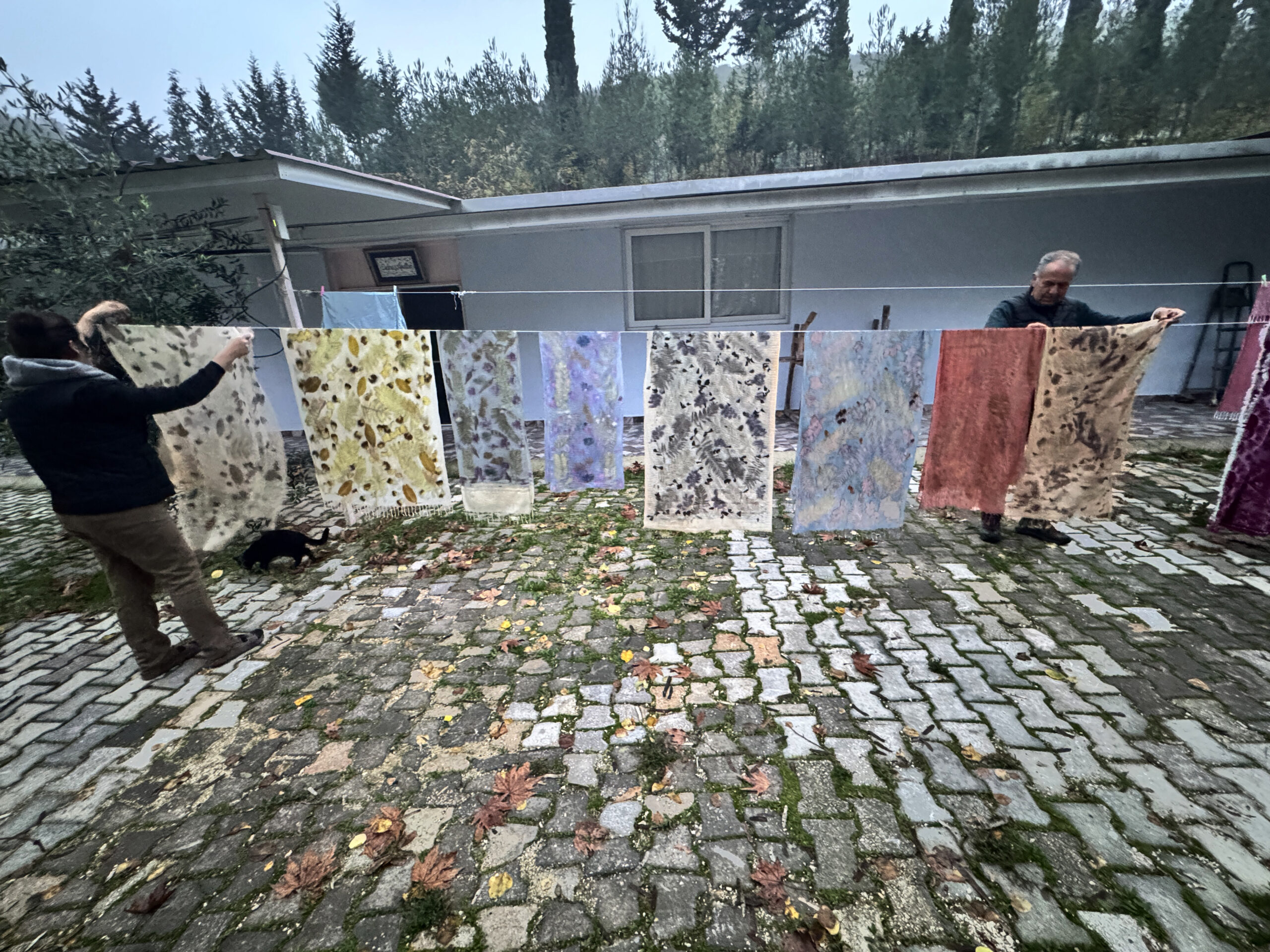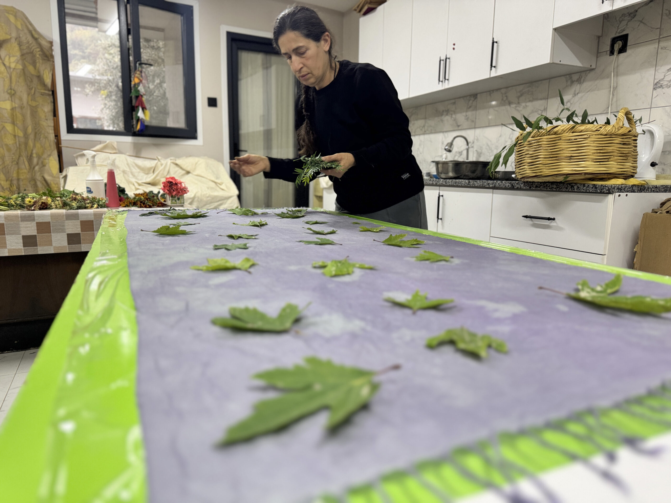 Papatya, sardunya, gül ve ahududu yaprakları ile dalları baskı malzemesi olarak kullanıp kumaşa desen veren Duman, lahana, havuç, dut ve böğürtleni kaynatmasıyla çıkan boyayla ürünlerini renklendiriyor.