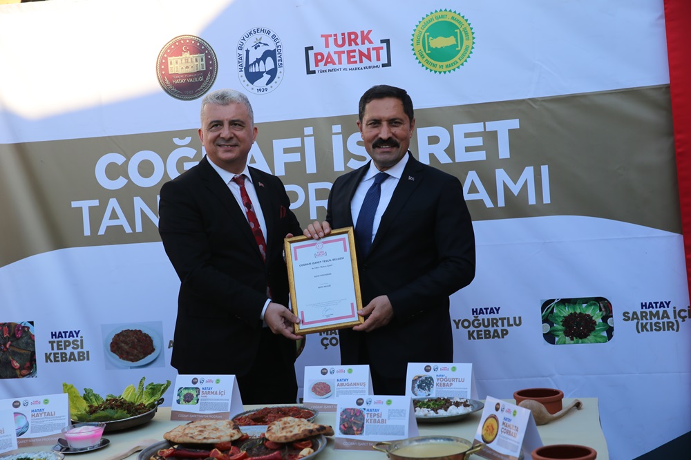 UNESCO’nun gastronomi alanındaki “Yaratıcı Şehirler Ağı”nda yer alan Hatay’ın yöresel lezzetlerinden tepsi kebabı, abugannuş, mahulta çorbası, yoğurtlu kebap, sarma içi-kısır, haydari ve haytalı Türk Patent ve Marka Kurumunca coğrafi işaret olarak tescillendi. Valiliğin girişimiyle coğrafi işaret belgesi verilen ürünler, Antakya Gastronomi Çarşısı’nda düzenlenen programla tanıtıldı.