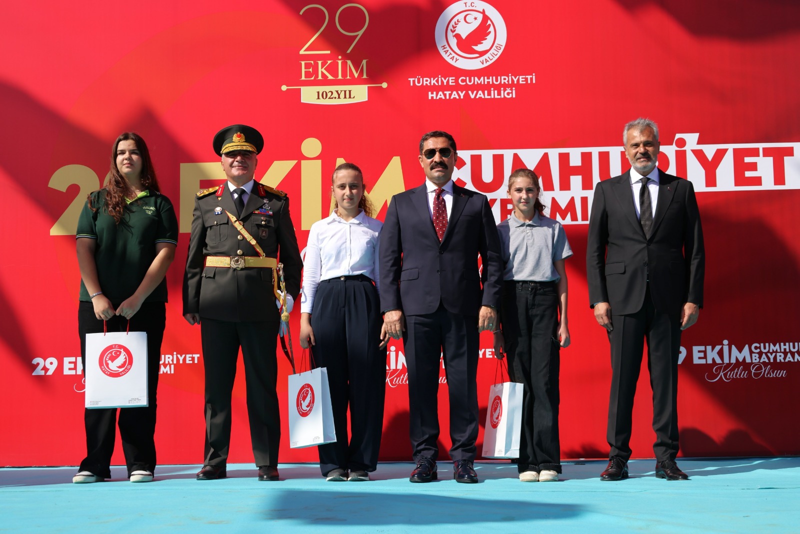 Hatay Valisi Mustafa Masatlı vatandaşların Cumhuriyet Bayramı’nı kutlayarak başladığı konuşmasında “Anadolu’ya 1071’de Malazgirt’te açılan kapı, 1453’te İstanbul’un fethiyle taçlanmış; 1915 Çanakkale’de ve 1919’da Samsun’dan yükselen istiklal ateşiyle, yeni bir yüzyılın temelleri atılmıştır.