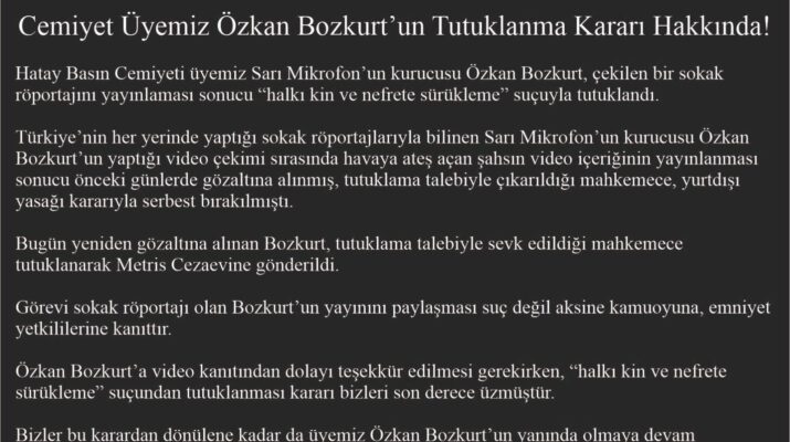 Hatay Basın Cemiyeti, üyesi ve Sarı Mikrofon’un kurucusu Özkan Bozkurt’un tutuklanmasına ilişkin yazılı bir açıklama yayımlayarak karara tepki gösterdi. Açıklamada, Bozkurt’un yalnızca sokak röportajı görevini yerine getirdiği vurgulandı ve “Bu yayın suç değil, kamuoyuna ve emniyete sunulmuş bir kanıttır” denildi.