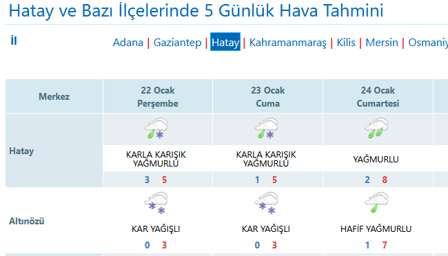 Hatay merkezde 22 Ocak Perşembe ve 23 Ocak Cuma günleri karla karışık yağmur bekleniyor. Hava sıcaklıklarının gece saatlerinde 1 dereceye kadar düşmesi, gündüz ise 5 derece civarında seyretmesi öngörülüyor. 24 Ocak Cumartesi günü ise yağışın yağmur şeklinde olması ve sıcaklıkların 2 ila 8 derece arasında değişmesi bekleniyor.