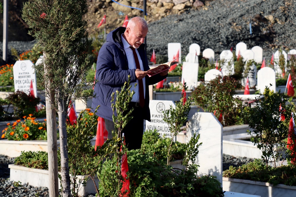 Ziyaretçilerden Tecettin Faiz (63), AA muhabirine, depremde 3 evladını kaybettiğini ve onların kabrine bayram ziyareti gerçekleştirdiğini söyledi.