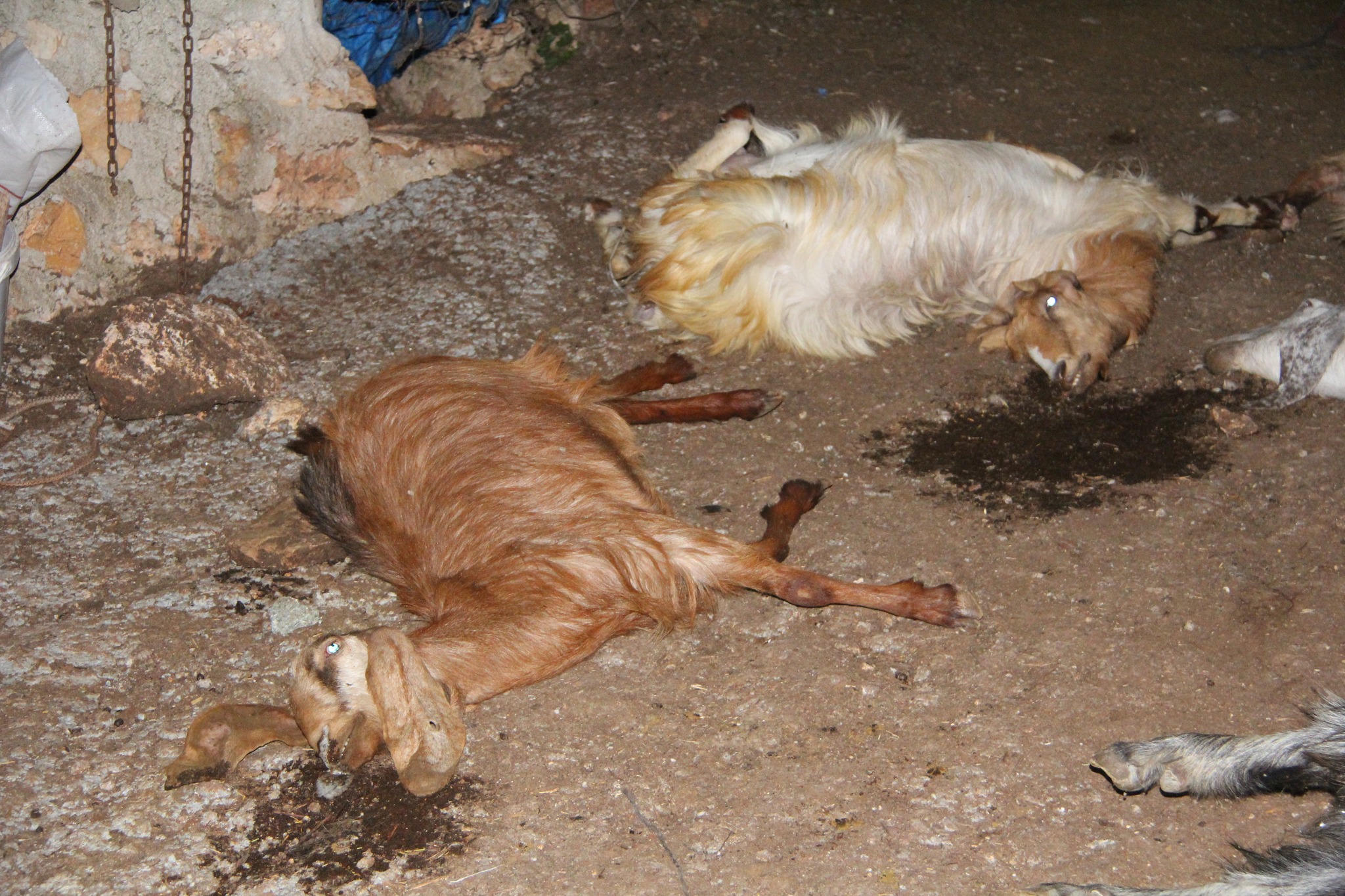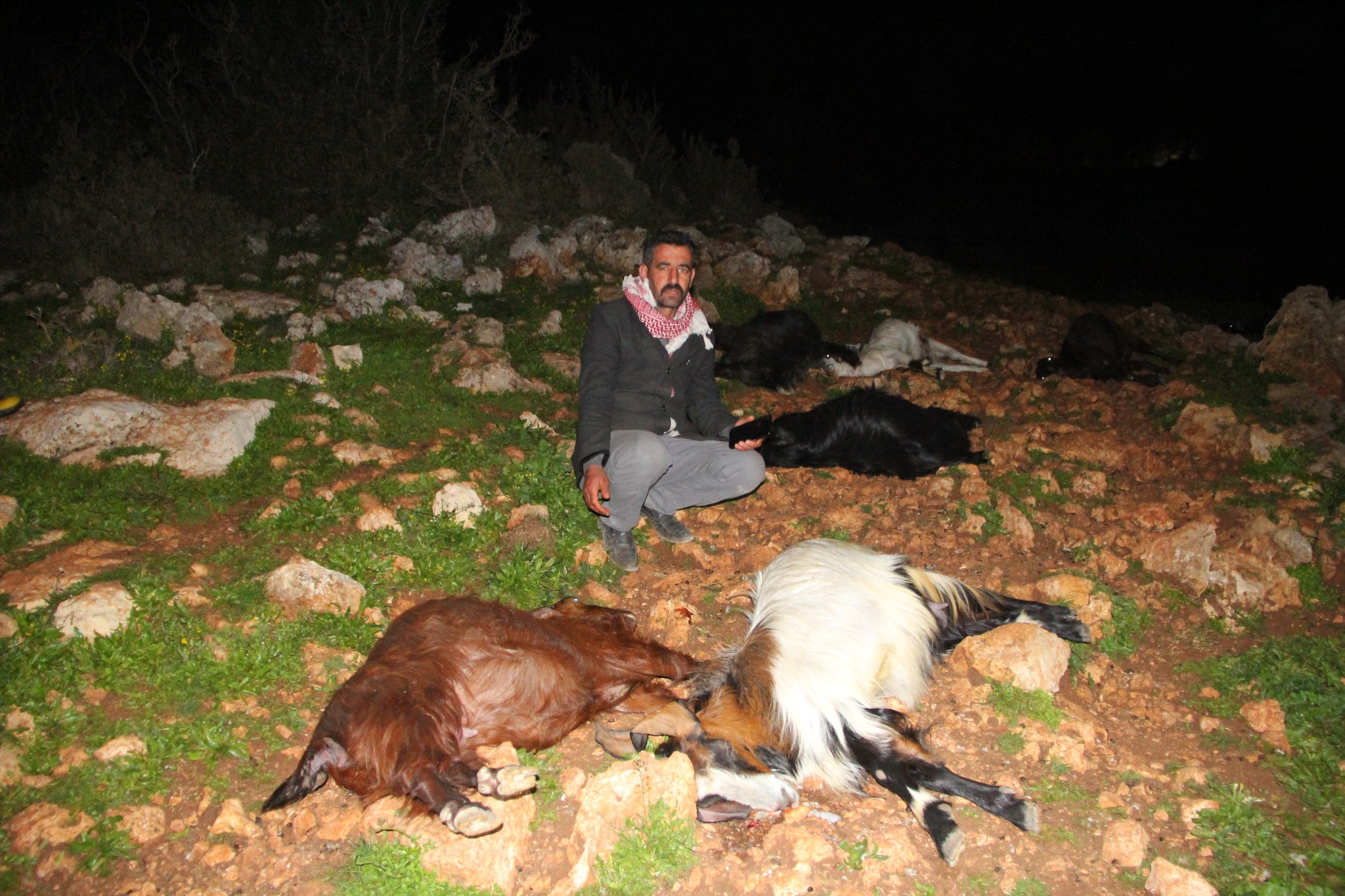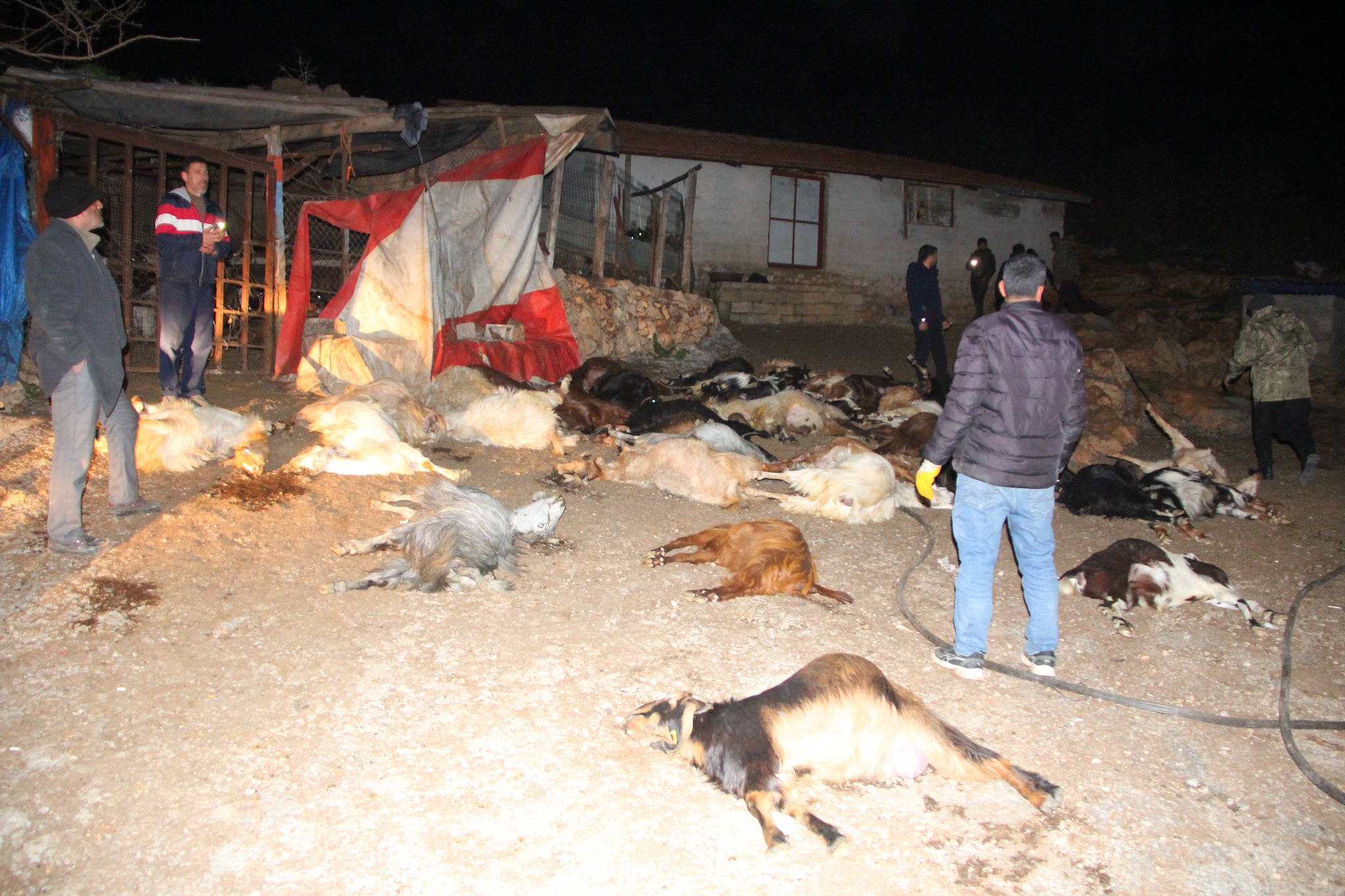 Yağmur suyunun biriktiği su birikintisinden su içen keçi ve koyunlar çiftliğe gelene kadar yolda teker teker telef oldular. Ne olduğunu anlamaya çalışan besici Nurullah Şengül, 112 acil çağrı merkezini arayarak yardım istedi.