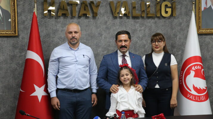 Hatay Valisi Mustafa Masatlı, TEKNOFEST Mavi Vatan Resim Yarışması’ndaki İlkokul kategorisinde Türkiye birincisi olan Asya Alyanak’a takdir plaketi verdi.