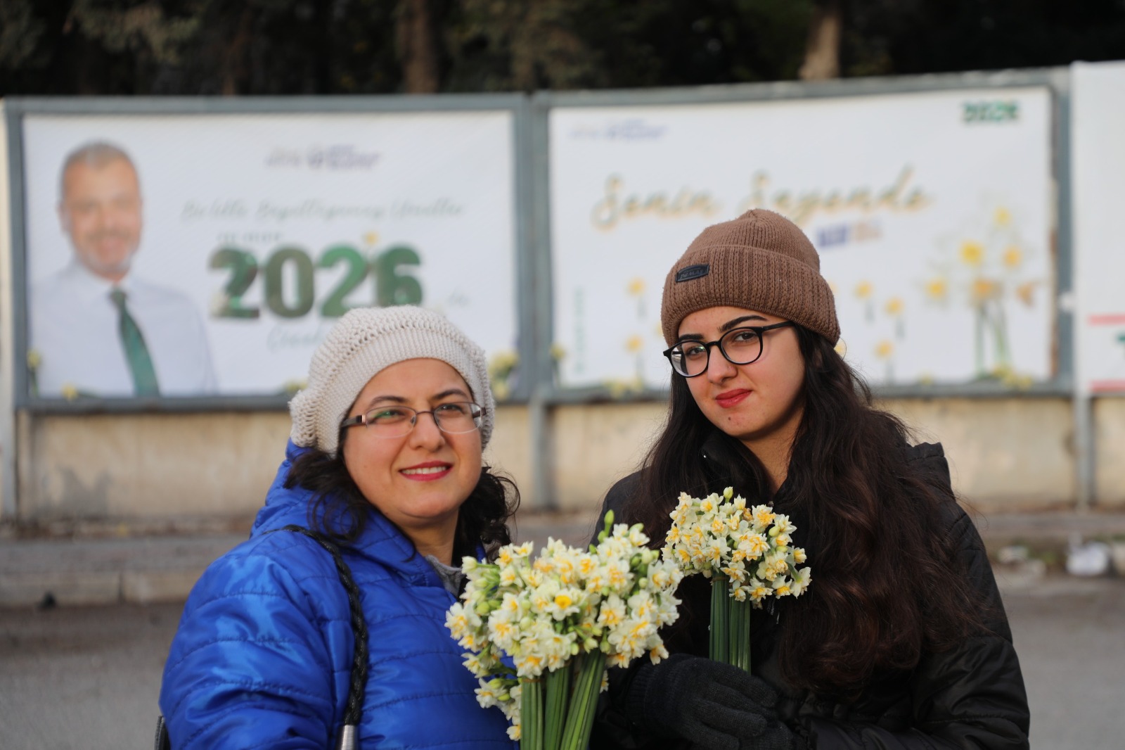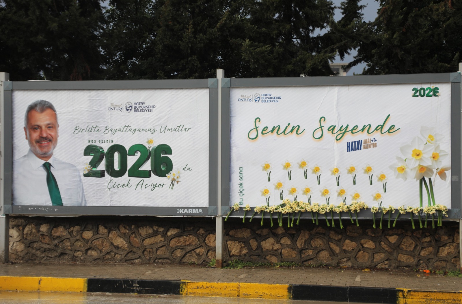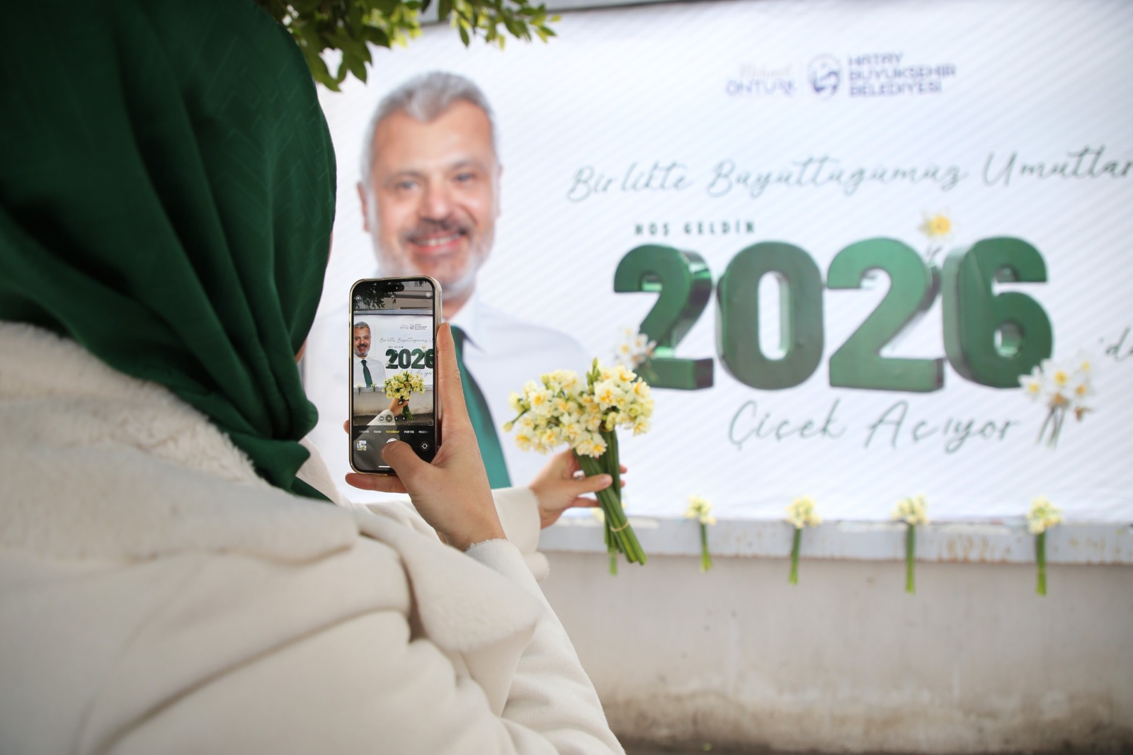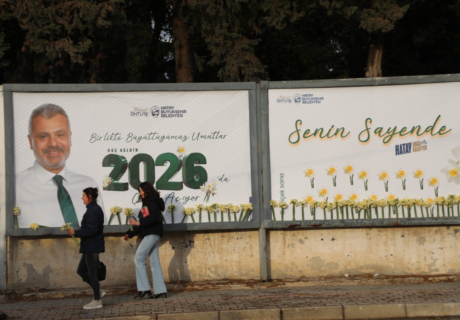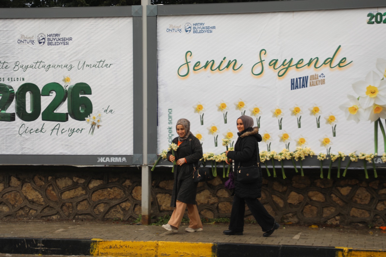Hatay Büyükşehir Belediyesi (HBB), 6 Şubat 2023’te yaşanan deprem sonrası çok zor şartlar altında yaşamalarına rağmen tam bir birlik, beraberlik ve dayanışma örneği göstererek hayata tutunan ve şehrin kalkınmasına destek veren Hatay halkına minnettarlığını göstermek adına farklı bir etkinliğe imza attı. HBB ekipleri, şehrin faklı noktalarında bulunan billboardlarda HBB Başkanı Mehmet Öntürk’ün “Birlikte Büyüttüğümüz Umutlar 2026’da Çiçek Açıyor” yazılı tebrik mesajlarının olduğu görsellerin üzerine Hataylı vatandaşlara yılbaşı hediyesi olarak demet demet nergis çiçekleri yerleştirdi.